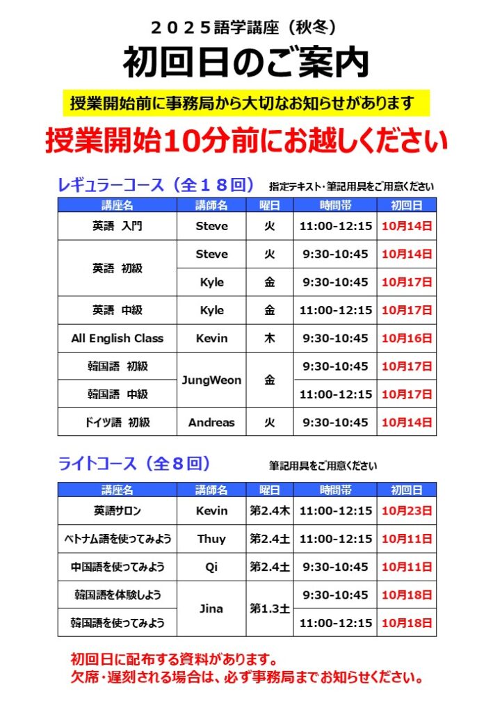 授業開始10分前にお越しください。